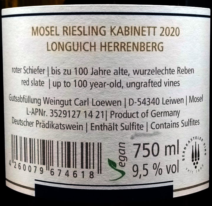 Ein eleganter, filigraner Riesling Kabinett mit saftiger Frucht und Frische. Die Fruchtsüße wird sehr schön gekontert durch die mineralisch Würze und salzige Noten.
