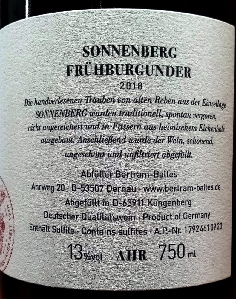 Hergestellt aus handgelesenen Frühburgunder-Trauben im Neuenahrer Sonnenberg. Spontan vergoren und in Fässern aus heimischer Eiche ausgebaut. Schonend, unfiltriert und ungeschönt abgefüllt.